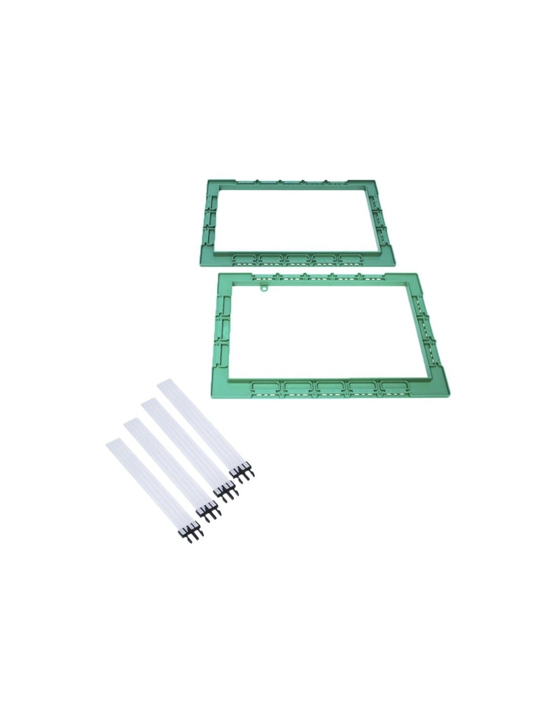 Комплект также снабжен перфорированными металлическими "крыльями", которые легко крепится к шпилькам с помощью скобок или гвоздей. Ребристые для повышенной жесткости, эти "крылья" позволяют комплекту легко охватывать до 24 дюймов. Окрашенные в белый цвет для легкой маркировки и размещения, эти металлические крылья, если необходимо, могут складываться по краю шпилек.