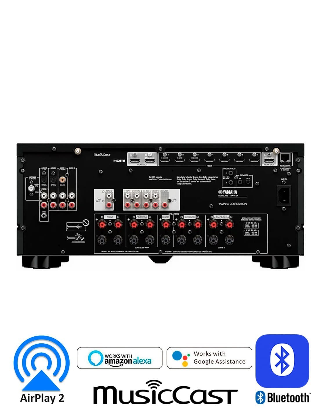 7.2 канальный аудио-видео ресивер. Мощность 170 Вт на канал. Технология SURROUND:AI™. Поддержка Dolby Atmos®, DTS:X, Dolby TrueHD и DTS-HD Master Audio. Поддержка 8K/60 Гц и 4K/120 Гц и HDR (HDR10+, HLG, Dolby Vision®, BT.2020). Функции SILENT CINEMA/Virtual CINEMA DSP. Функция YPAO™-R.S.C. Технология Bluetooth® с Music Enhancer™. LAN порт, Wi-Fi, MusicCast, AirPlay 2. ЦАП премиум-класса ESS Hyperstream ES9007S 384 кГц/32 бит. eARC (усовершенствованный реверсивный звуковой канал). Тюнер AM/FM/DAB. Регулировка тембра фронтальных каналов L/R. Энергосберегающий режим ECO. Размеры (ШхВхГ): 435×191×442 мм. Вес: 16,2 кг.