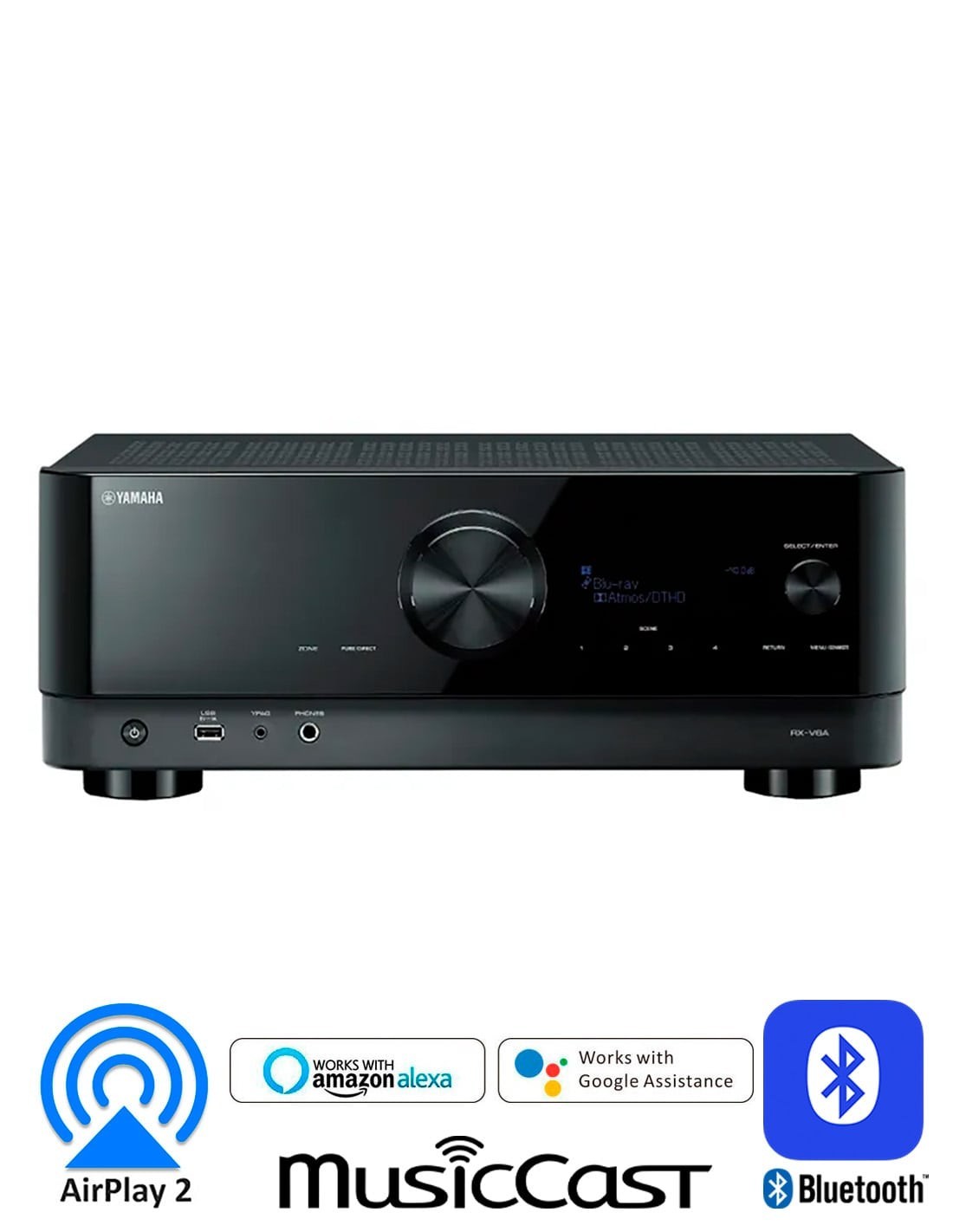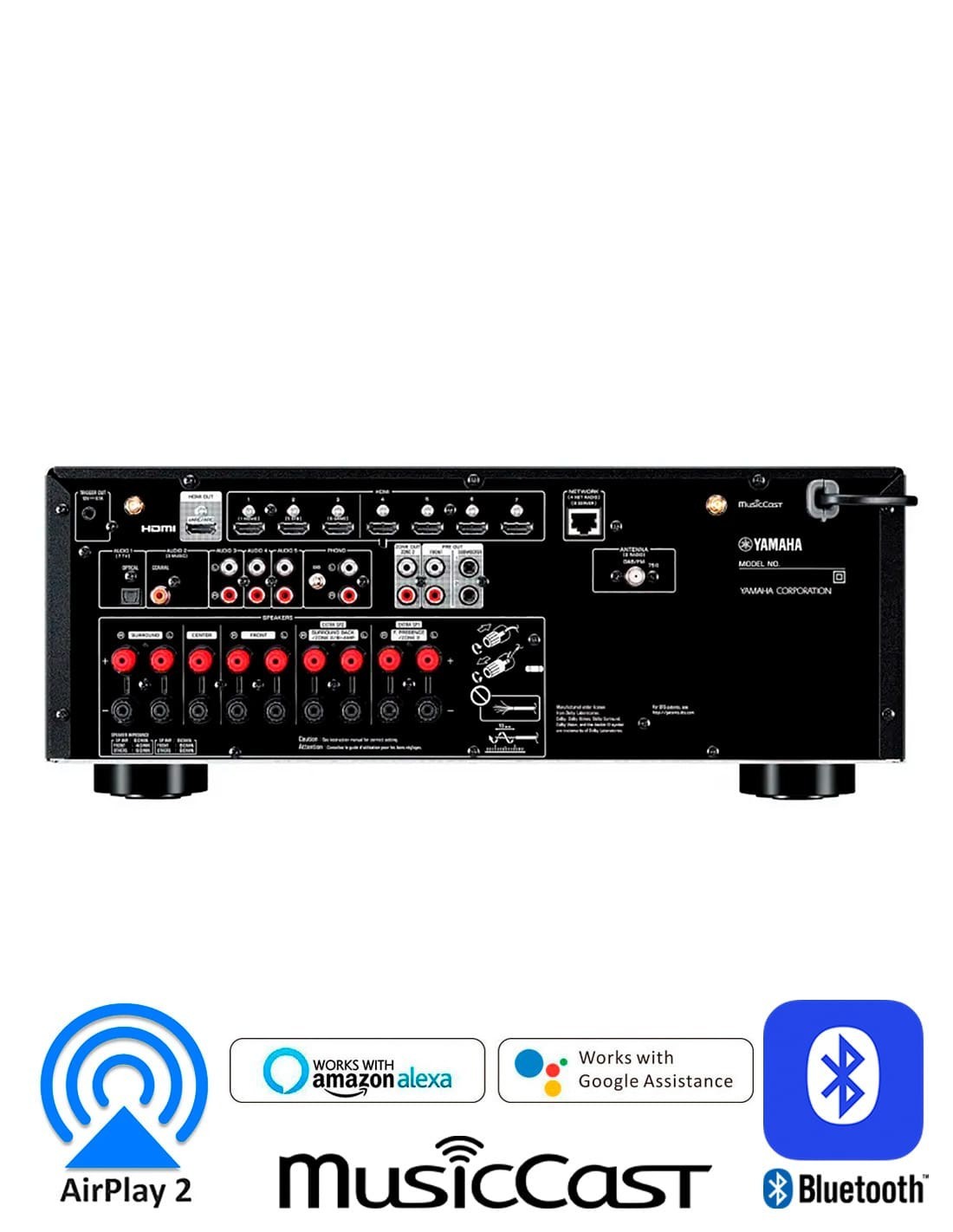7.2 канальный аудио-видео ресивер. Мощность 160 Вт на канал. Поддержка Dolby Atmos®, DTS:X, Dolby TrueHD и DTS-HD Master Audio. Поддержка 4K/120 Гц и HDR (HDR10+, HLG, Dolby Vision®, BT.2020). Функции SILENT CINEMA/Virtual CINEMA DSP. Функция YPAO™ (Yamaha Parametric room Acoustic Optimizer). Технология Bluetooth® с Music Enhancer™. LAN порт, Wi-Fi, MusicCast, AirPlay 2. ЦАП премиум-класса Burr-Brown 384 кГц/32 бит, PCM5101A. eARC (усовершенствованный реверсивный звуковой канал). Тюнер AM/FM/DAB. Регулировка тембра фронтальных каналов L/R. Энергосберегающий режим ECO. Размеры (ШхВхГ): 435×171×377 мм. Вес: 9,8 кг.