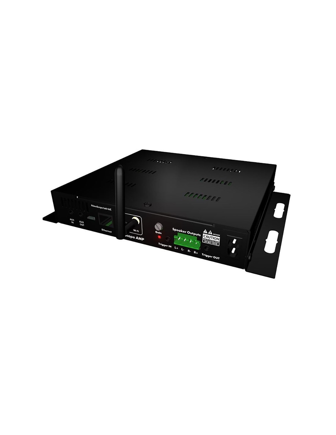 AirScope AMP - двух канальный усилитель-стример, предназначен для домашних аудио мультирум систем. Выходная мощность 50 Вт на канал, Wi-Fi приёмник, RCA вход и Ethernet LAN разъём для локальной домашней сети. Размеры: 170x40x170 мм, Вес: 1,7 кг.