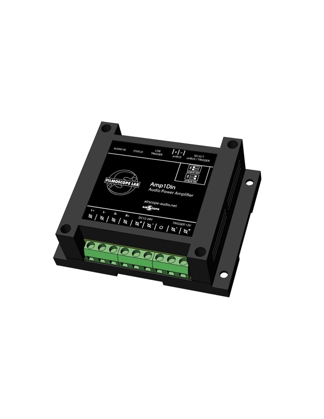 AirScope AMP1Din - это инновационный стерео усилитель. Может управляться через 12 В триггерный вход, 5 В USB триггерный вход или через управляющий сигнал airBus от airScopeX1Din.