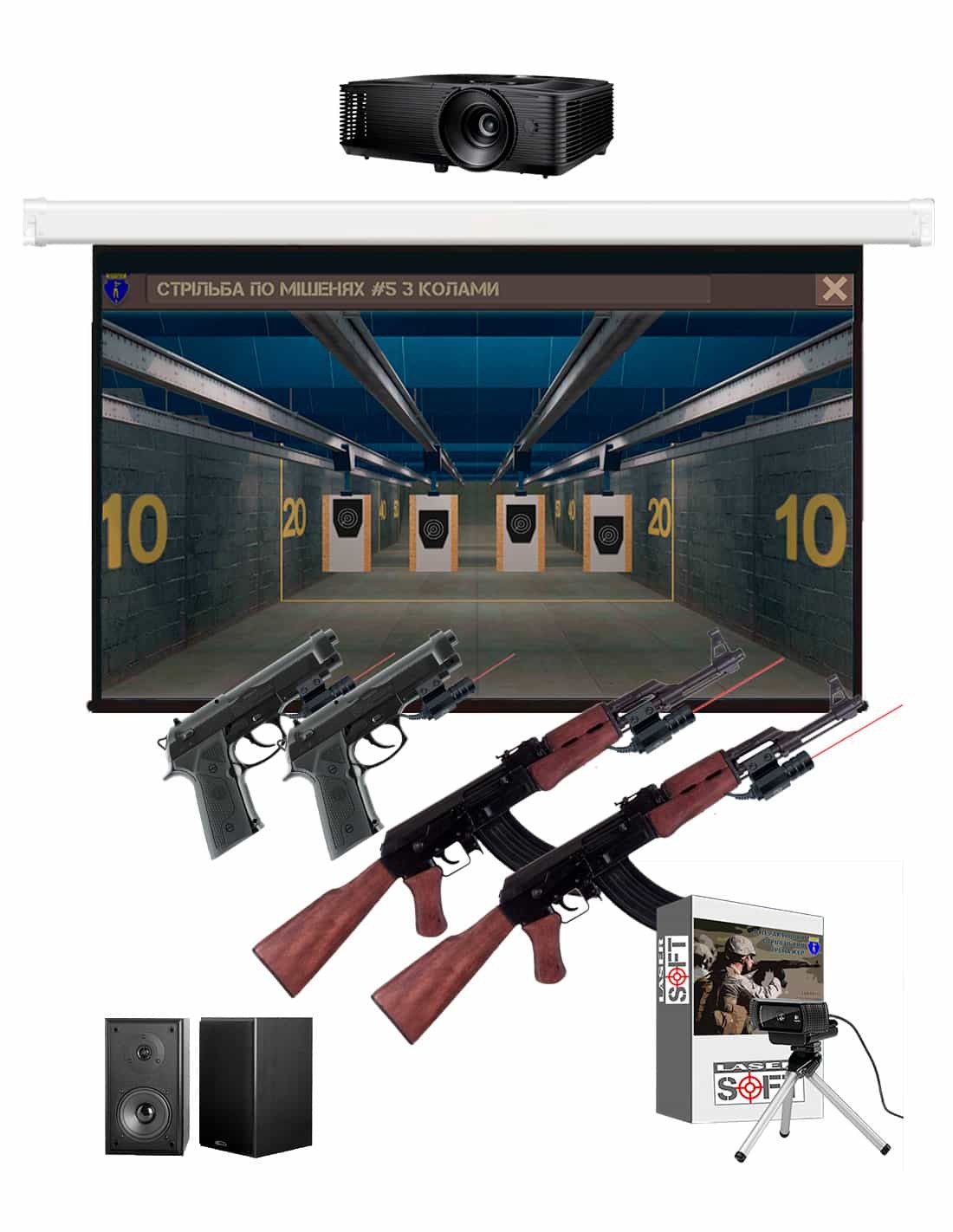 Комплект оборудования для 4-х стрелков аппаратно-программного комплекса интерактивного лазерного тира "Защитник Отечества®". Компьютерный тренажер для имитации беспулевой стрельбы с использованием макетов пистолета Beretta и автомата Калашникова АК-47 с навесными лазерными целеуказателями.