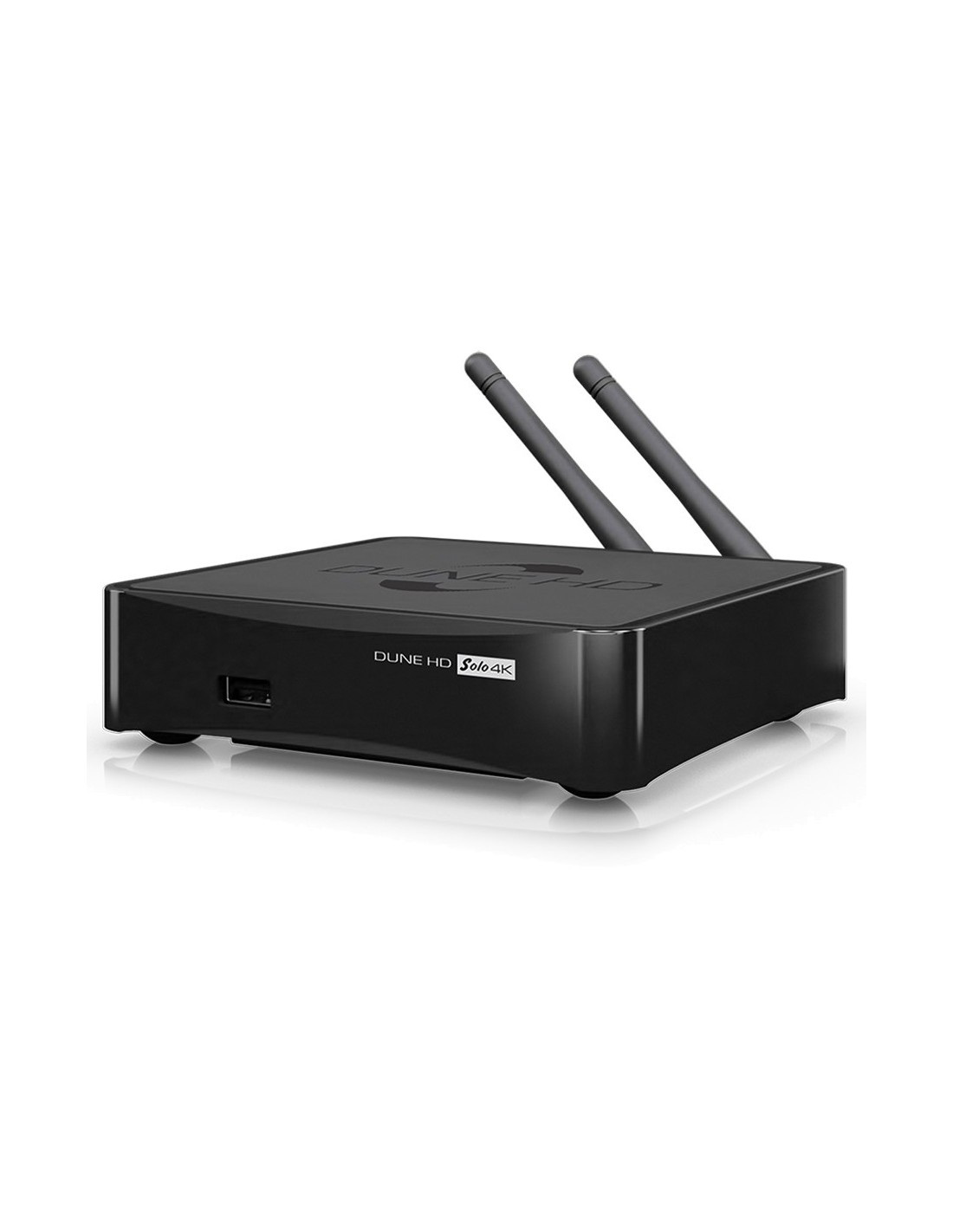 Модель собрана в мини-корпусе с фигурной фронтальной панелью, в которую встроен USB-порт. В тыльную часть корпуса интегрирован выдвижной лоток для установки 2,5” HDD (SATA) с функцией горячей замены. На тыльной панели Dune HD Solo 4K имеется HDMI-выход, гигабитный LAN-порт, USB-порт и универсальный 3,5 мм AV-выход (совмещает в себе композитный, аналоговый и коаксиальный S/PDIF выходы). Присутствует ИК-вход, гнездо для обычной антенны и пара сокетов для двух Wi-Fi-антенн (поддерживается 2-диапазонный Wi-Fi с параметрами 802.11 b/g/n/ac, 2T2R, 2,4 и 5 ГГц). Для питания используется внешний адаптер. Есть тюнер DVB-T/T2 для просмотра/записи программ цифрового ТВ.