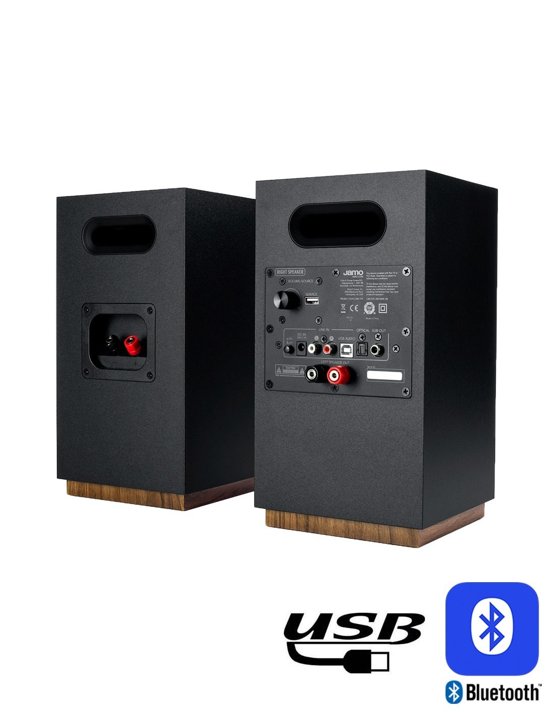 У Jamo Studio S 801 PM достаточно богатая входная коммутация. Кроме аналоговых RCA, предусмотрены цифровые входы — оптический и USB-аудио. Еще один USB-разъем предназначен для сервисного подключения.