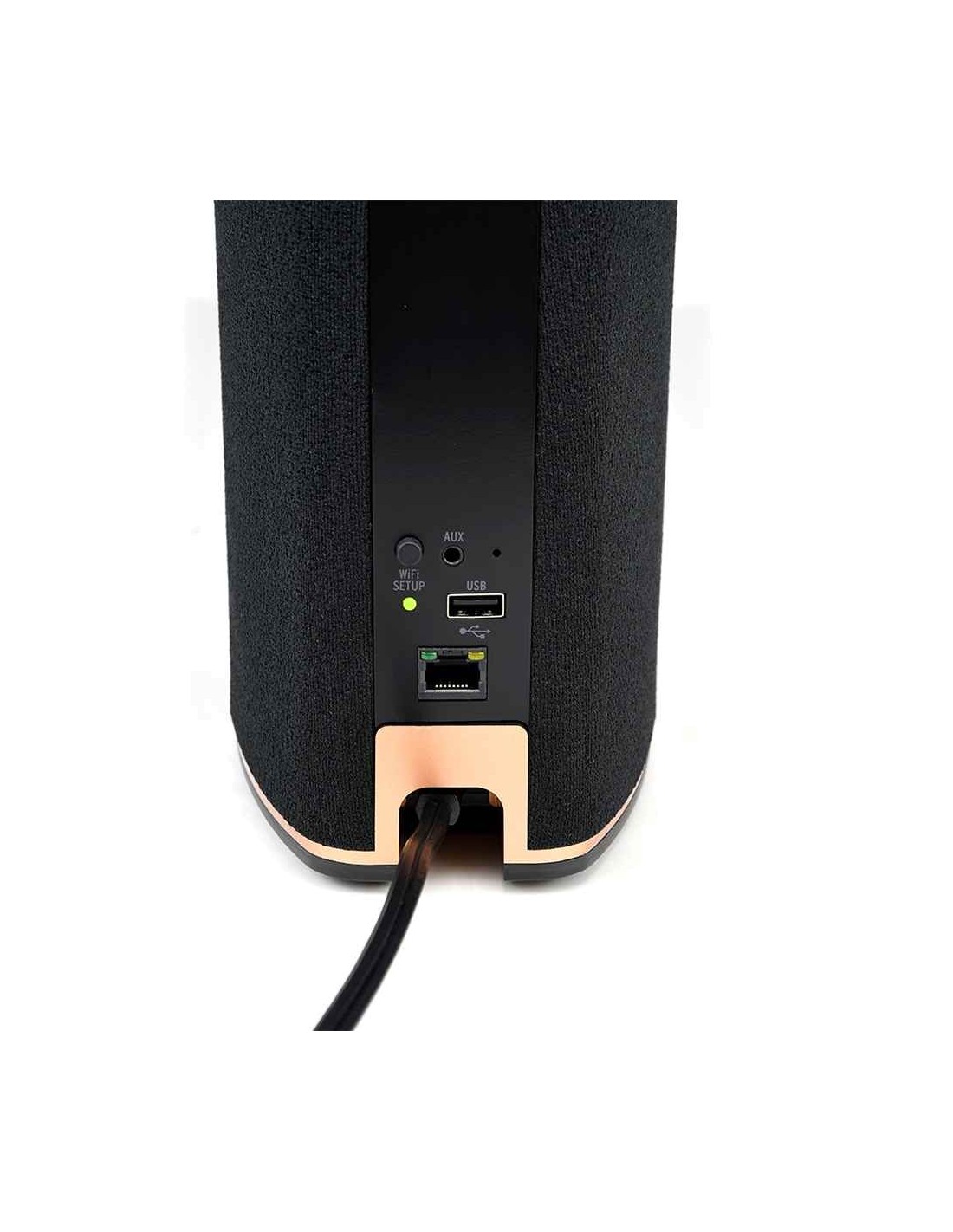 Акустическая система Klipsch RW-1 имеет скругленные стенки и суживающийся к тыльной стороне корпус, почти вся боковая поверхность которого затянута приятной на ощупь черной тканью. Габариты колонки составляют 228 мм в высоту и около 127 мм в ширину и глубину. Дизайн RW-1 весьма минималистичен и единственным ее украшением является полоска-ободок медного цвета с логотипом фирмы по центру в основании корпуса. Таким образом поддерживается единый стиль оформления акустики Klipsch (медный/черный), и в целом колонка смотрится весьма выигрышно. В основании АС предусмотрена сплошная резиновая «подошва», которая не позволит ей скользить на любой поверхности, а органы управления – всего четыре кнопки с подсветкой – находятся сверху. Сзади расположены гнездо для питающего кабеля (он утоплен в основание и практически не заметен), разъем Ethernet, гнездо mini-jack 3,5 мм линейного входа, а также USB-разъем для обновления встроенного ПО. Колонка Klipsch довольно увесистая и сделана очень качественно, благодаря чему будет прекрасно смотреться в интерьере.
