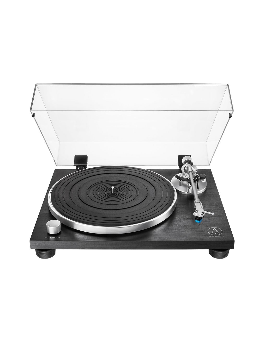 - Полностью ручное управление с ременным приводом и двумя скоростями: 33-1/3 и 45 об/мин