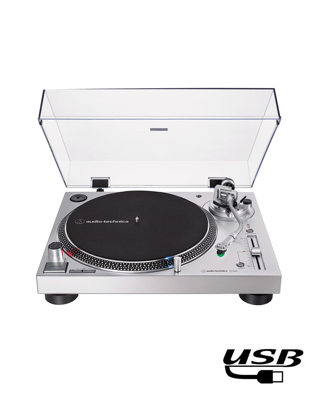 Проигрыватель винила Audio-Technica AT-LP120XUSB поставляется с адаптером на 45 об/мин. Дополнительные функции включают литой алюминиевый диск с войлочным ковриком; кнопка старт/стоп; выбираемая высокоточная кварцевая блокировка высоты тона и ползунковый регулятор изменения высоты тона с диапазонами регулировки +/-8% или +/-16%; стробоскопический диск с индикатором скорости; съемный стилус со штепсельным разъемом; внешний источник питания; съемная откидная пылезащитная крышка. Проигрыватель доступен в черном (AT-LP120XUSB-BK) и серебристом (AT-LP120XUSB-SV) цветах.