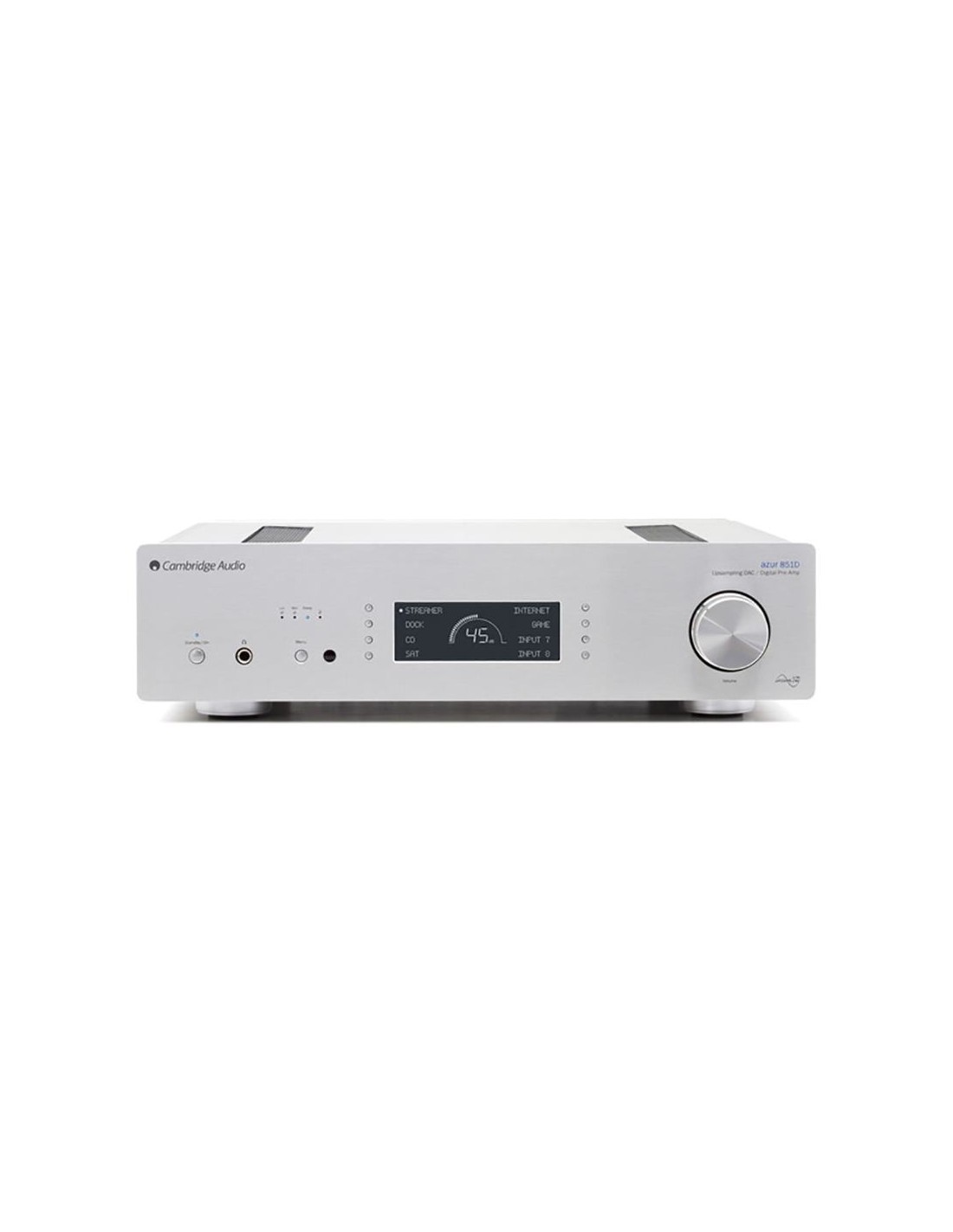 Cambridge Audio Azur 851D имеет полноразмерный металлический корпус, противостоящий вибрациям и защищающий внутренние элементы от шумов и помех. На передней алюминиевой панели расположен дисплей, отображающий уровень громкости и выбранный источник, а также меню настройки. Рядом с ним находятся кнопки селектора входов. В правой части фасада установлен регулятор громкости, который можно использовать и для настройки баланса. Слева имеется клавиша питания/standby, 6,3 мм разъем для наушников, кнопка перехода в меню настройки и индикаторы фильтров.