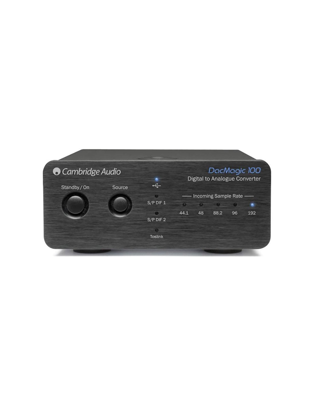 Цифро-аналоговый преобразователь DacMagic 100 компании Cambridge Audio предназначен в первую очередь тем пользователям, кому необходим не просто конвертор, но и продвинутый источник с возможностью подключения к компьютеру по USB. Аппарат поддерживает частоты дискретизации входного цифрового сигнала 32, 44.1, 48, 88.2, 96 и 192 кГц (соответствующий режим работы обозначается включением светодиода на передней панели), и имеет два коаксиальных цифровых входа, один оптический, и вход USB. Для питания устройства используется внешний источник.