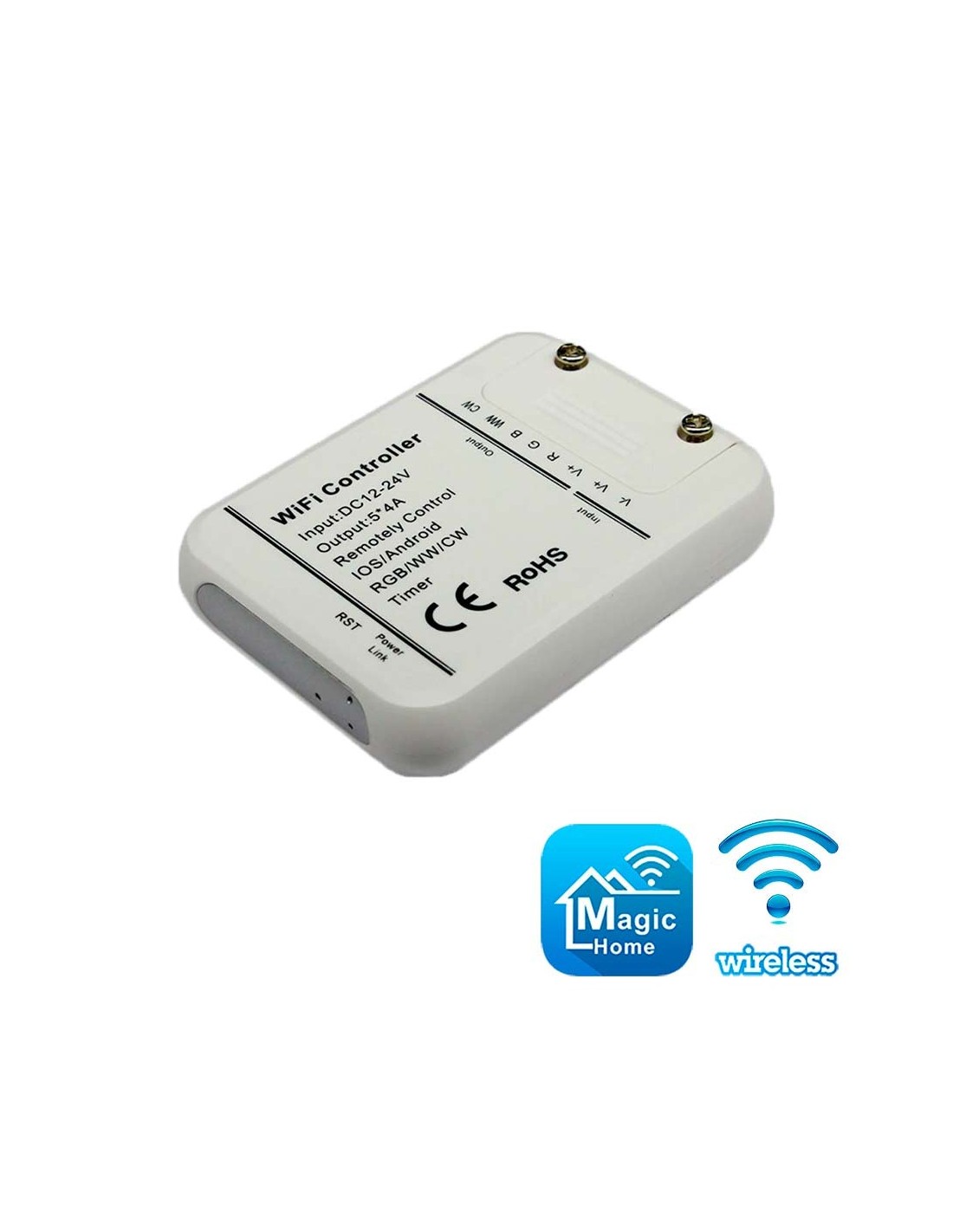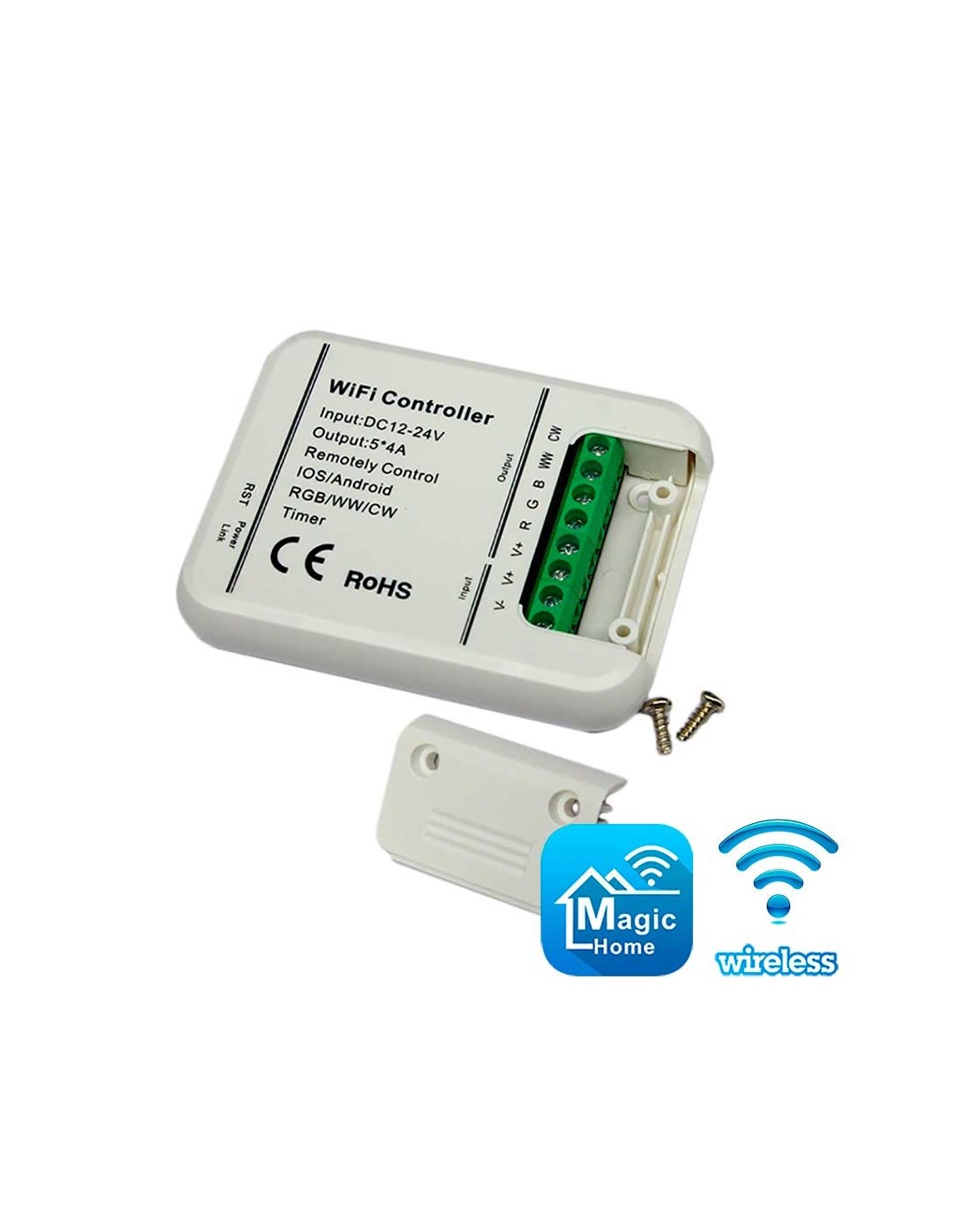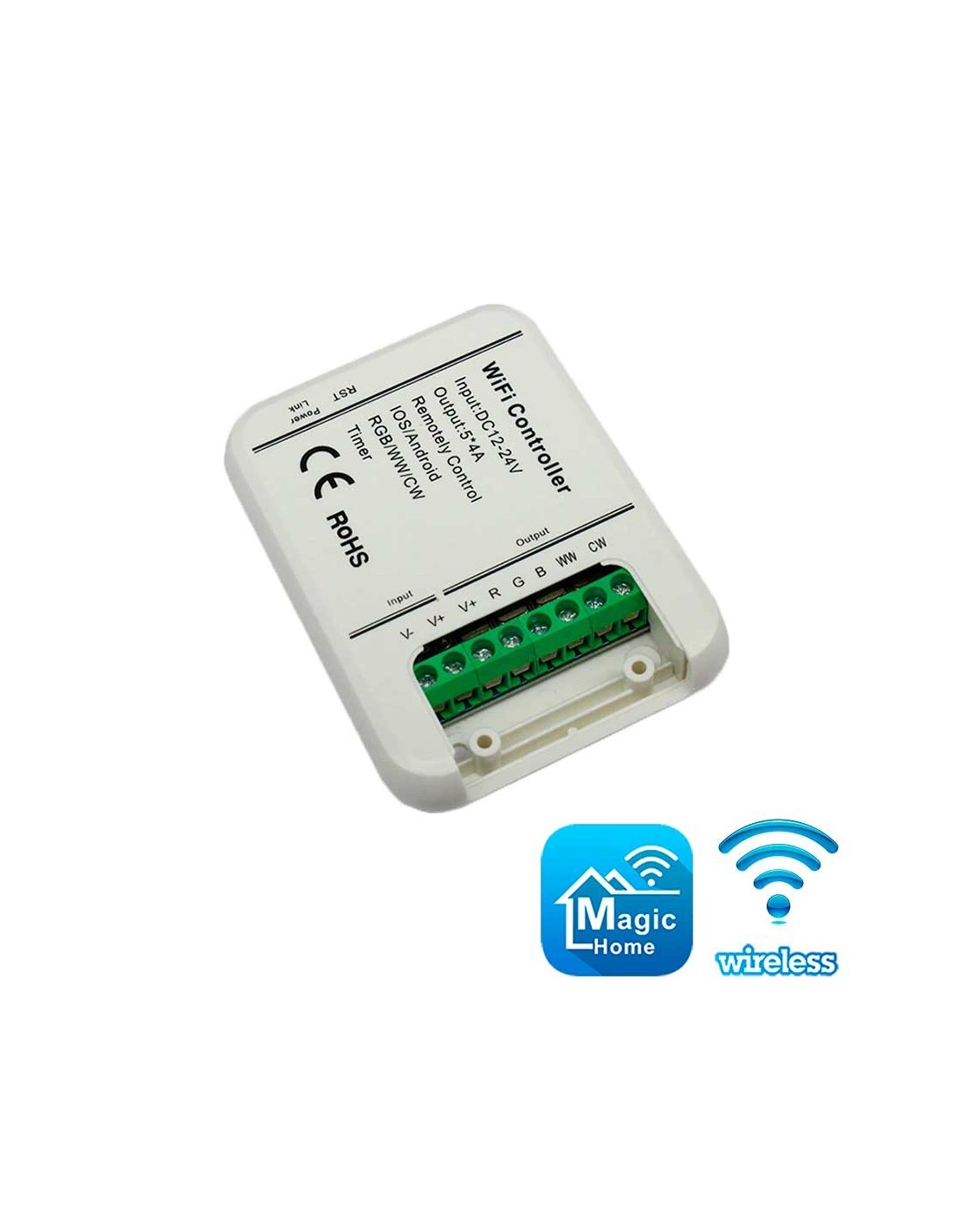 WiFi SMART контроллер RGBWC 5-in-1 и CCT 2-in-1 светодиодных лент. Поддерживает типы светодиодов: SMD5050. Управление яркостью и температурой цвета. Приложение Magic Home Pro для смартфона/планшета с iOS/Android. WiFi 2,4 ГГц, 802.11 b/g/n. Питание 12В-24В DC. Мощность нагрузки 240 Вт. Интеграция с IFTTT, Google Home и Alexa. Размеры (ДхШхВ): 82х62х16 мм, вес 0,08 кг.