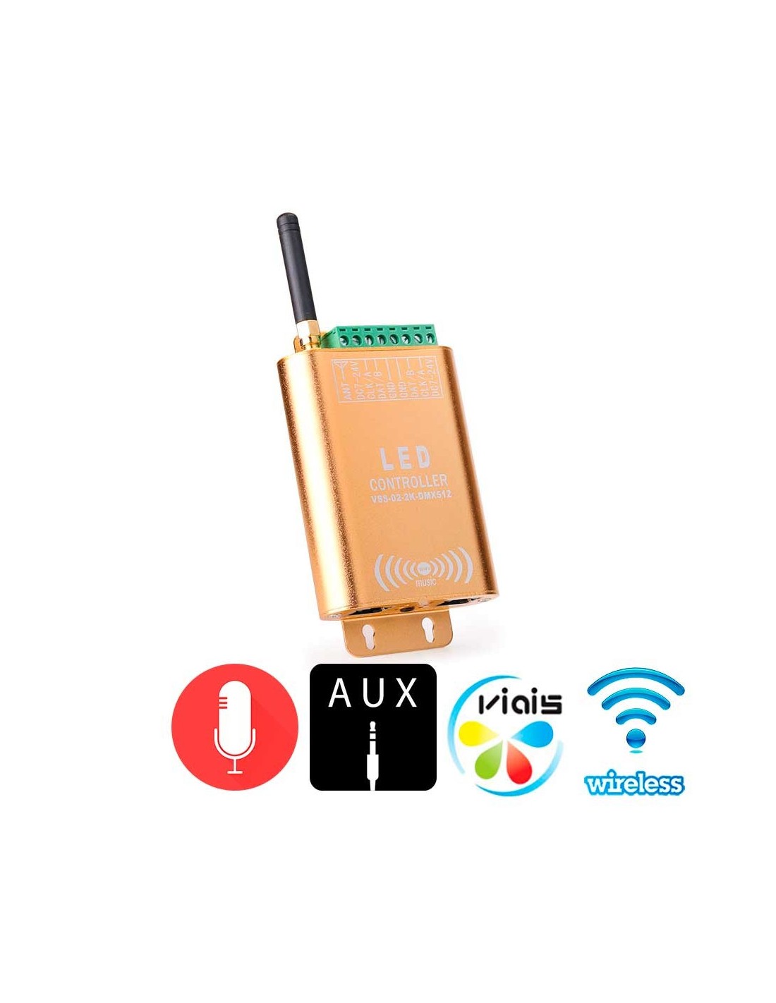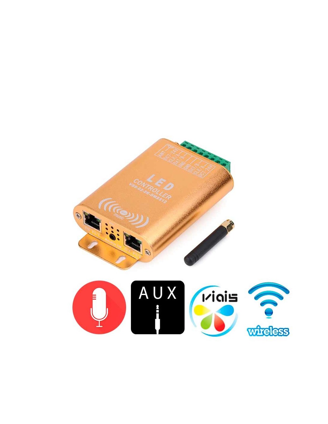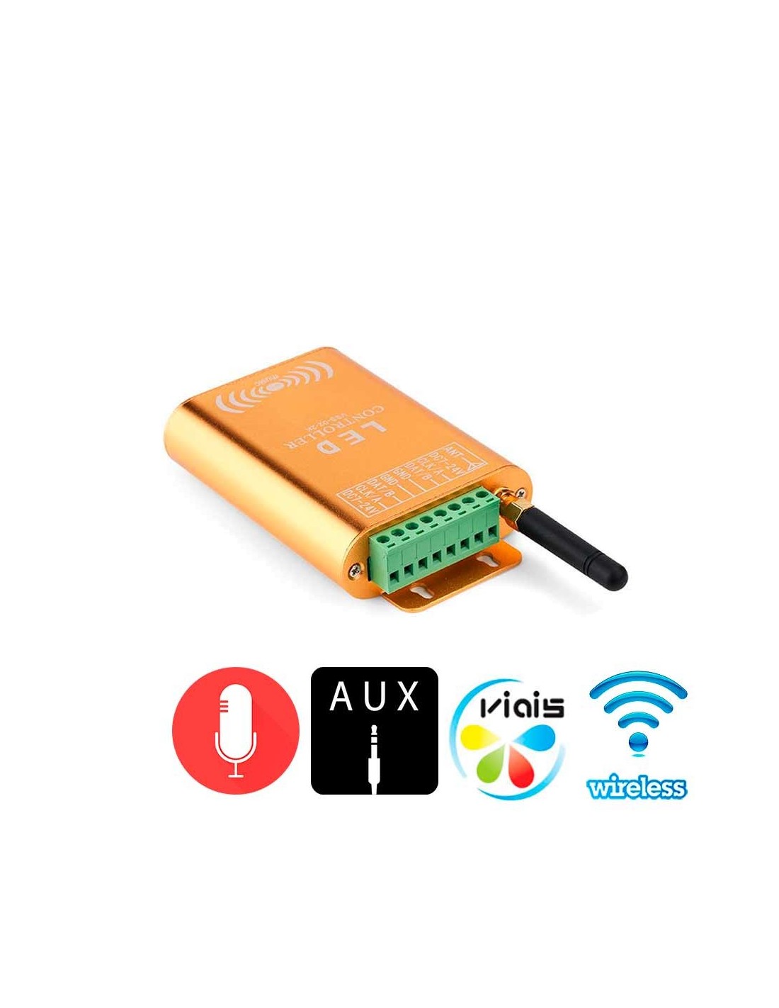 Цветомузыкальный WiFi SPI контроллер Pixel LED лент. Поддерживает типы светодиодов: WS2811, WS2812B, WS2801, SK6812, WS2813, DMX512. Встроенный микрофон, вход AUX. Управление эффектами в Viais-LED App для смартфона/планшета с iOS/Android. WiFi 2,4 ГГц, 802.11 b/g/n. Выход: 2 порта (CLK, DAT, GND). Кол-во пикселей до 4096. Питание 5В-24В DC. Размеры (ДхШхВ): 120х70х24 мм, вес 0,34 кг.