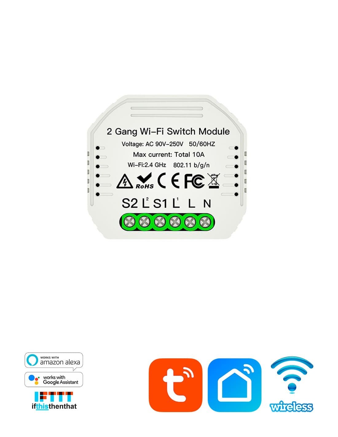Встраиваемый 2-канальный WiFi выключатель Tuya Smart, управление по локальной Wi-Fi сети или удаленно через интернет с планшета или смартфона, приложения Tuya Smart® и Smart Life® для Android и iOS, голосовое управление Google Assistant, Amazon Alexa и IFTTT, сценарии, таймер, будильник. max мощность 2300 Вт., max ток 10 А. Размеры (ШхВхГ): 52x47x18 мм, вес 0,08 кг.